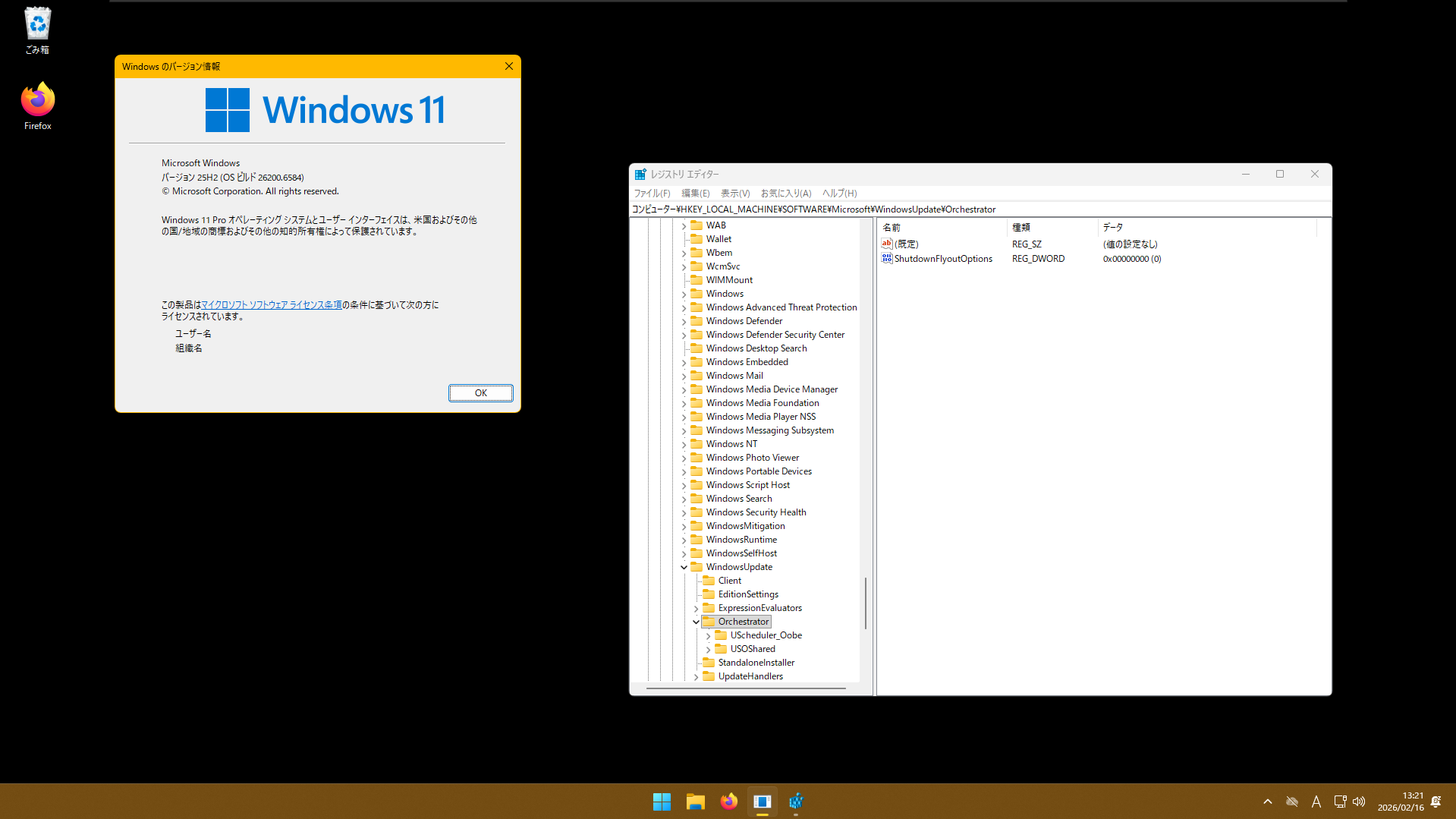 The Ultimate Fix for a Forced Windows Update - YouTubeの内容が本当かどうか仮想マシンに新規インストールした Windows 11 Pro (25H2)で検証してみた。ShutdownFlyoutOptionsについて以下の設定値を試した。
